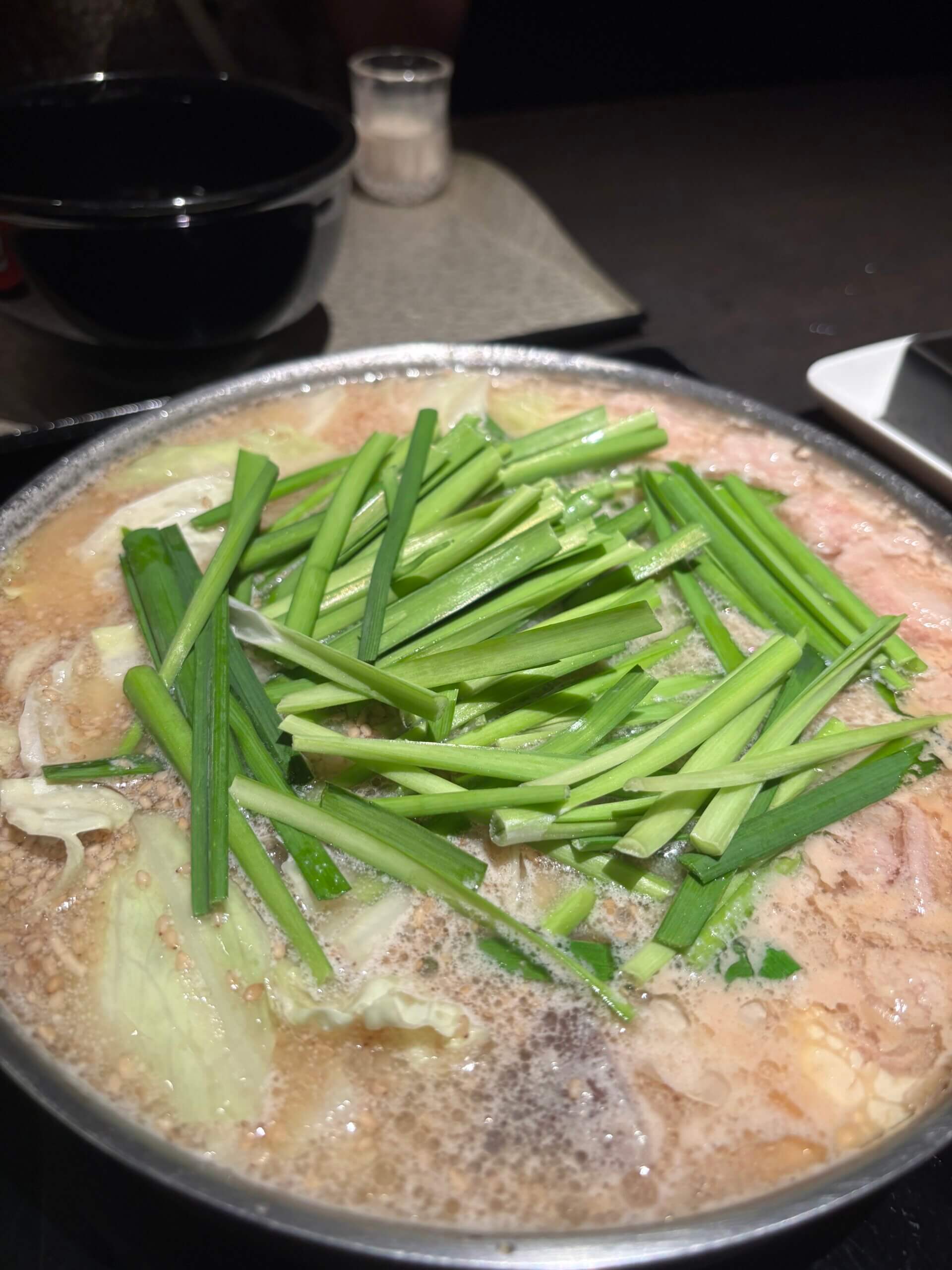 もつ鍋ってにらをめっちゃ入れるんですね。にらタワーみたいになってましたよ。